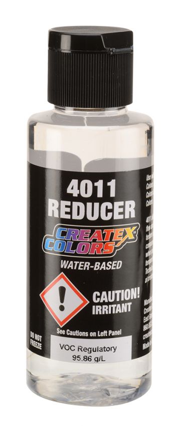 The recommended thinner for all Createx paints and clears, 4011 Reducer is used to lower viscosity when airbrushing. 4011 promotes faster drying times and complete curing and is generally added 5% - 10% per volume to paint. If more reducer is needed to achieve detailed flow at low pressure settings, 4011 can be added in increments of 5% per volume, but should not need to exceed 20% of the total mixture. Refer to CreatexTech.com for more information about thinning and mixing specific color type.