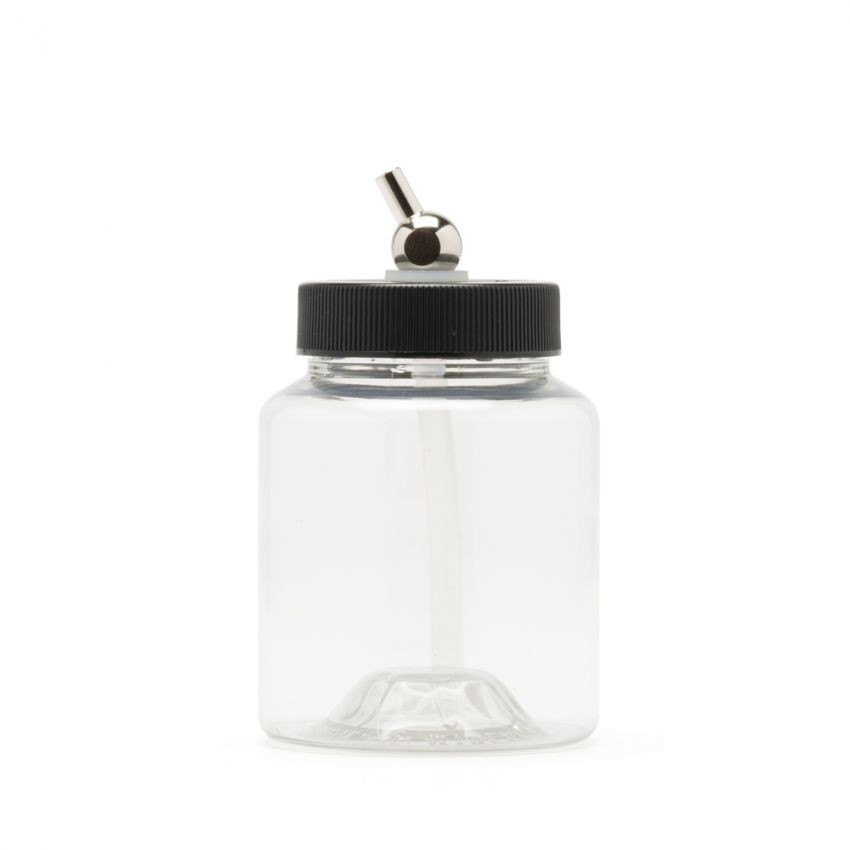 Iwata Crystal Clear Bottle 2 oz / 60 ml Jar with adaptor cap for water-based paints. Iwata Crystal Clear Bottles reveal actual paint colors. The no-rust metal friction fit connector easily affixes onto your airbrush. Comes with an Iwata Redi-Cap to store or transport paint.