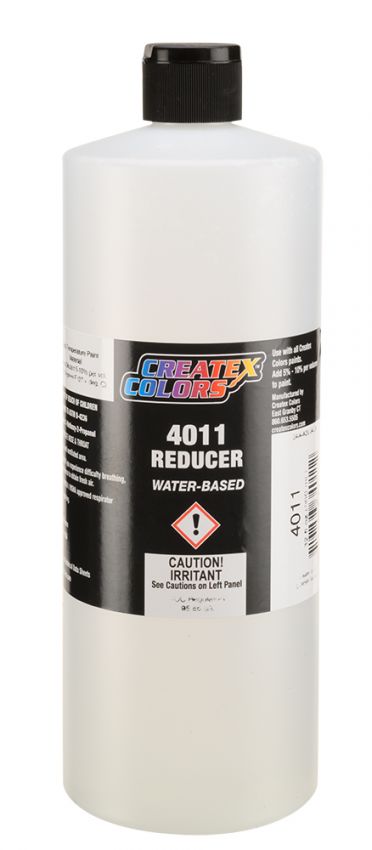 The recommended thinner for all Createx paints and clears, 4011 Reducer is used to lower viscosity when airbrushing. 4011 promotes faster drying times and complete curing and is generally added 5% - 10% per volume to paint. If more reducer is needed to achieve detailed flow at low pressure settings, 4011 can be added in increments of 5% per volume, but should not need to exceed 20% of the total mixture. Refer to CreatexTech.com for more information about thinning and mixing specific color type.