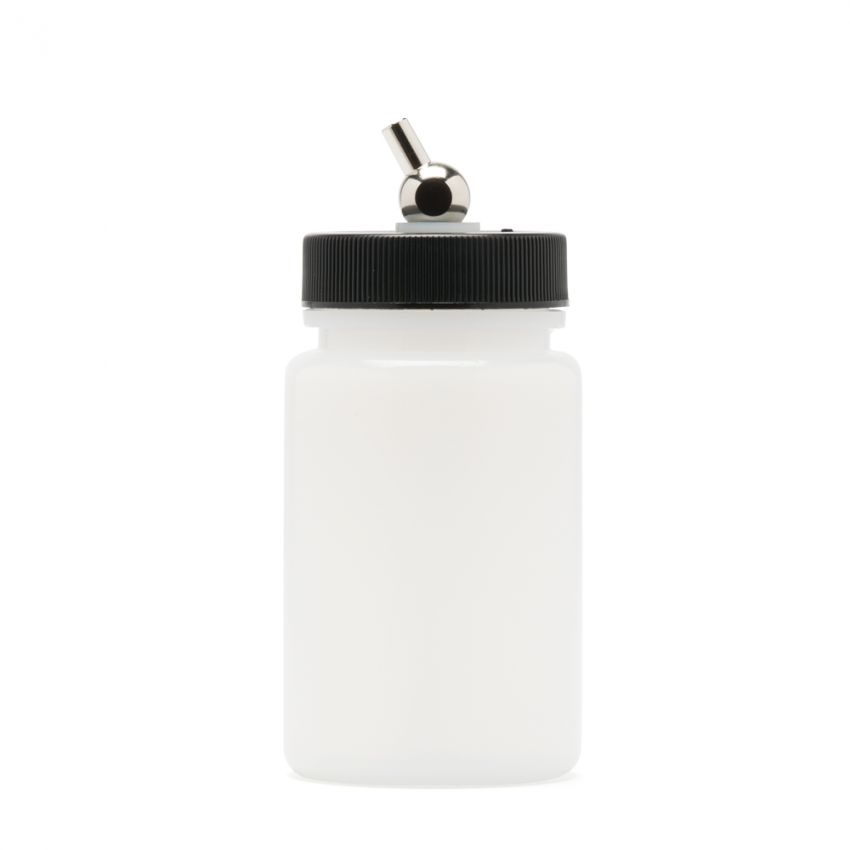 Iwata High Strength Translucent Bottle 3 oz / 84 ml Jar with adaptor cap is solvent-proof for all airbrush paint mediums. The no-rust metal friction fit connector easily affixes onto your airbrush. Comes with an Iwata Redi-Cap to store or transport paint.