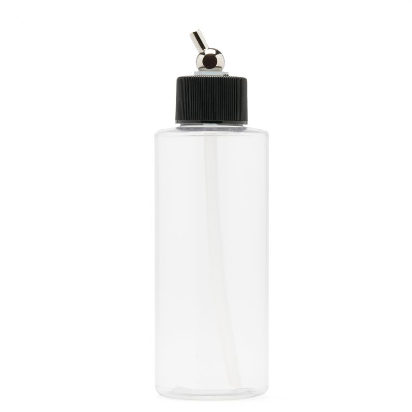 Iwata Crystal Clear Bottle 4 oz / 118 ml Cylinder with adaptor cap for water-based paints. Iwata Crystal Clear Bottles reveal actual paint colors. The no-rust metal friction fit connector easily affixes onto your airbrush. Comes with an Iwata Redi-Cap to store or transport paint.