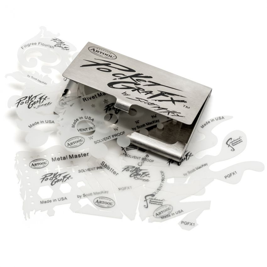 Artool PocketGraFX Freehand Airbrush Template Set by Scott MacKay. These pocket-sized solvent proof stencils, with their rugged stainless steel holder, are the perfect on-the-go variety pack to create unlimited designs and effects. Use them with paintbrush, ink, sponge, spray paint, pastels and more or follow our tutorial to create designs using your airbrush. Simply cut the tabs to release each shape and store them in the convenient holder. Solvent Proof mylar construction: great with both solvent and water based paints. Easy to clean. Template Size: 3.5 x 2 inches.