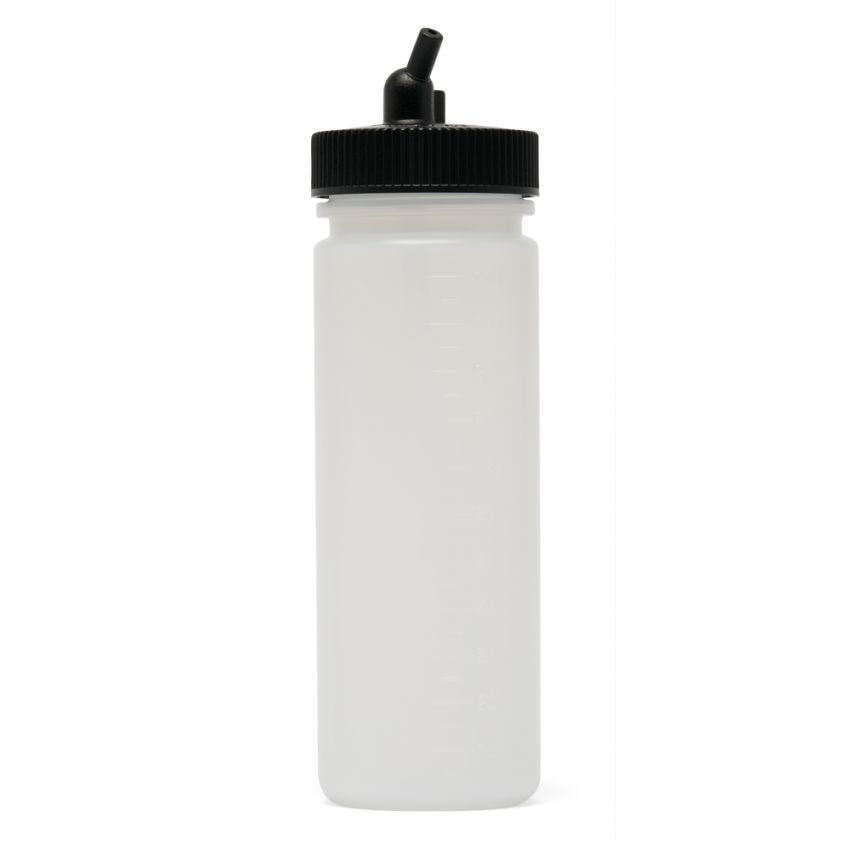 Iwata Big Mouth Airbrush Bottle 4 oz / 118 ml Cylinder with 38 mm adaptor cap is solvent-proof for all airbrush paint mediums. This is a durable, graduated cylinder with a large opening for pouring and mixing paint. The domed, high-strength one piece adaptor cap with offset friction fit connector easily affixes onto your airbrush. It's raised air intake creates a splash-proof opening. The detachable pick up tube makes this an easy to clean cap.