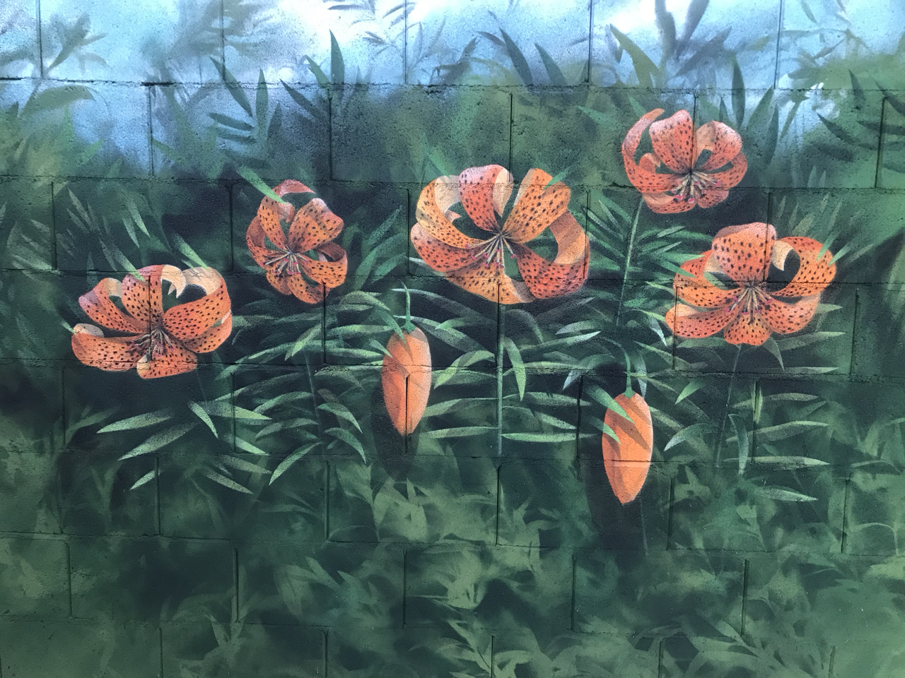 Exterior Wall Mural: Detail of tiger lilies; Airbrush with urethane aerosol cans