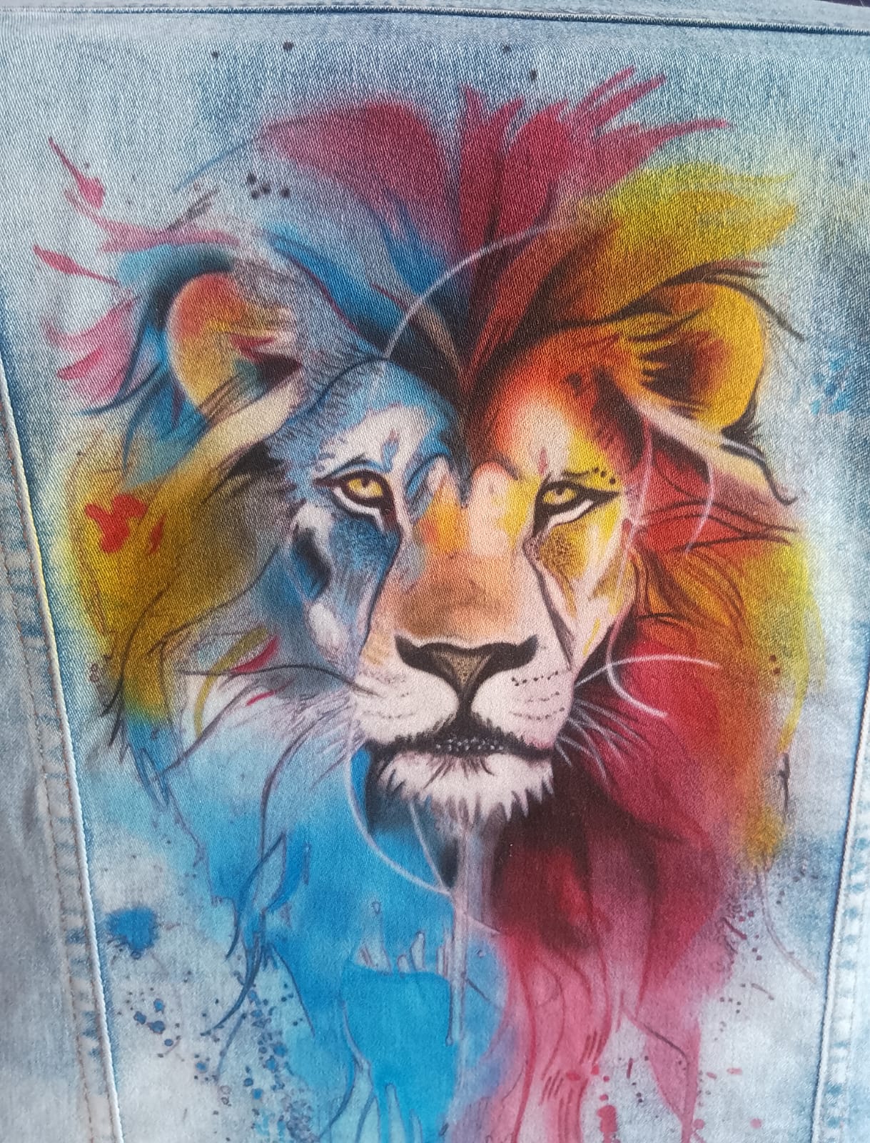 Airbrushing work on a denim jacket, using an Iwata Eclipse HP-CS airbrush