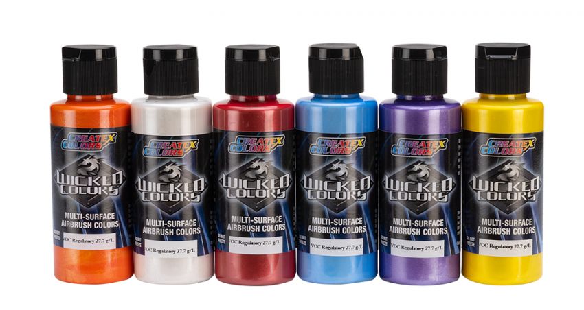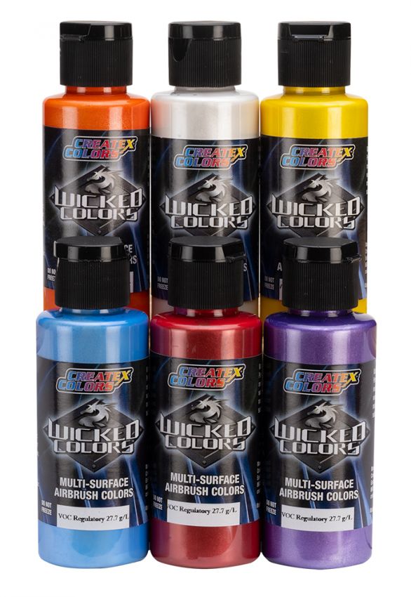 Wicked Pearlescent Colors are water-based, multi-surface airbrush acrylics designed for versatility with optimum performance on any project. Transparent, pearl powders combined with a durable resin make Wicked Pearlescent Colors an excellent choice for interior or exterior applications. Pearlescent colors refract light and create brilliant effects when top-coated with a gloss clear such as Createx 4050 UVLS Gloss.