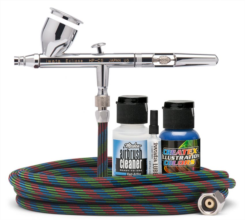 The set includes Iwata Eclipse HP-CS Gravity Feed Dual Action Airbrush, Iwata Airbrush Hose, Medea Airbrush Cleaner, Createx Illustration Colors Cerulean Blue, Iwata Lube, Eclipse Head Cap Wrench and an Airbrush Users Guide.