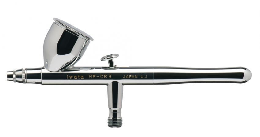 Exclusive to Revolution Series, HP-CR3 Gravity Feed Dual Action airbrush features a unique, comfort handle and an R3 Head System. If you love how our Revolution BR sprays but crave a larger fluid cup, then the Iwata Revolution CR3 is for you. Iwata Revolution HP-CR3 has a 0.24 oz 7 ml fluid cup with lid that is ideal for color mixing.