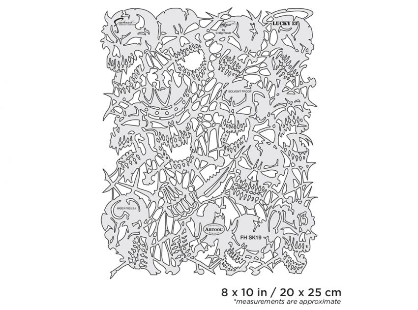 Artool Return of Skullmaster Lucky 13 Freehand Airbrush Template by Craig Fraser. Precision, laser cut templates for highly detailed effects. Solvent Proof mylar construction: great with both solvent and water based paints. Easy to clean. Create your favorite effects with Artool.