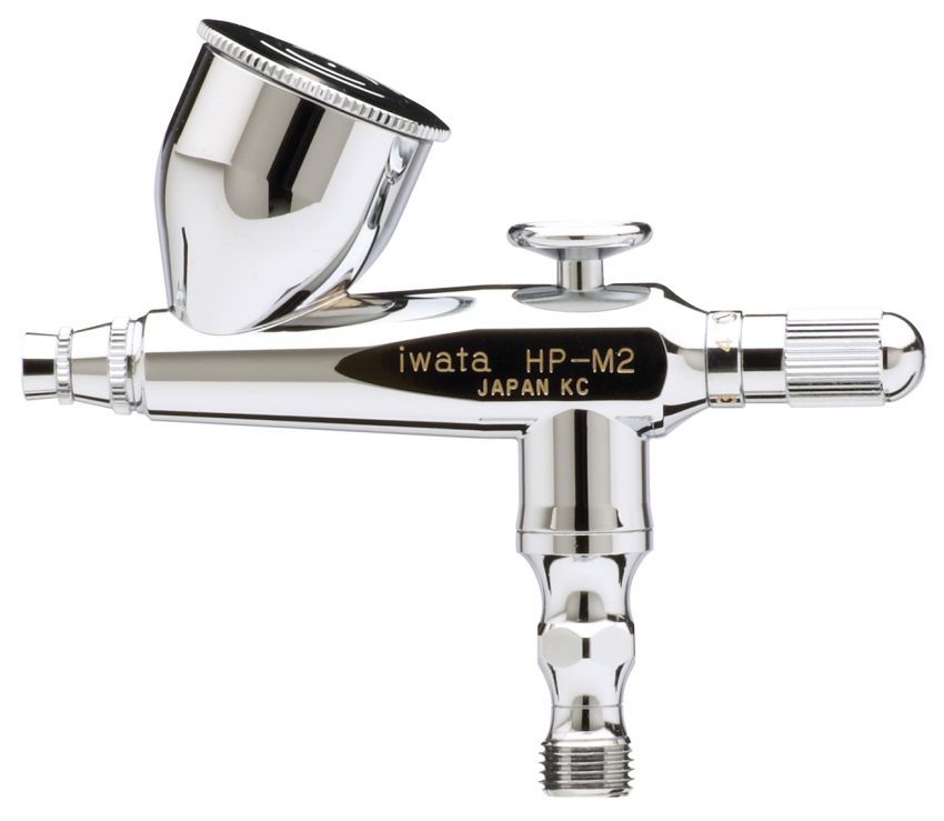 Iwata Revolution HP-M2 Gravity Feed Single Action airbrush features a compact size and easy to operate single action delivery.  It has a 0.24 oz / 7 ml fluid cup with Lid that is ideal when using small amounts of spray medium.